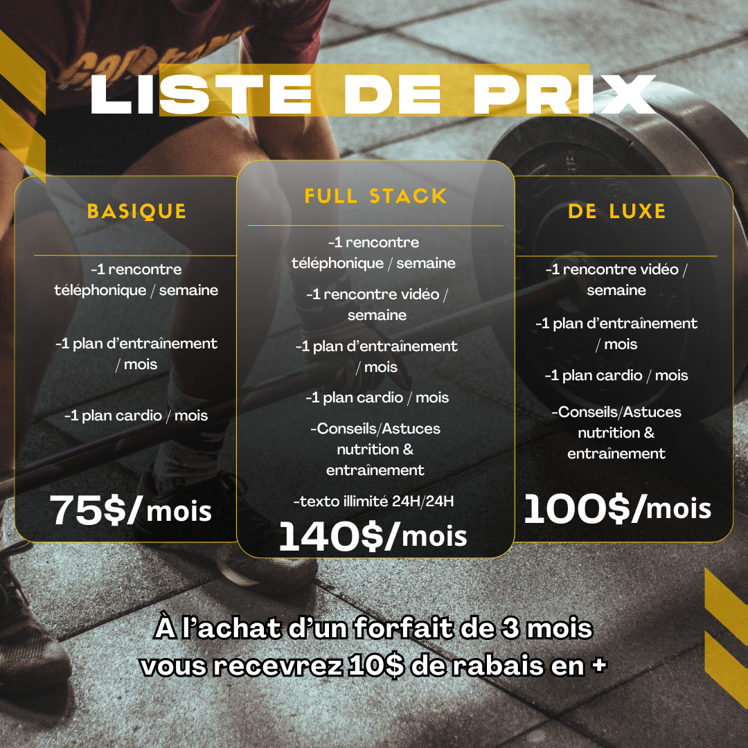 📈 My services are available online and in French, with personalized weekly follow-ups to ensure you stay on track. I create customized training and nutrition programs, and include video consultations and phone calls to provide you with the support you need, when you need it.